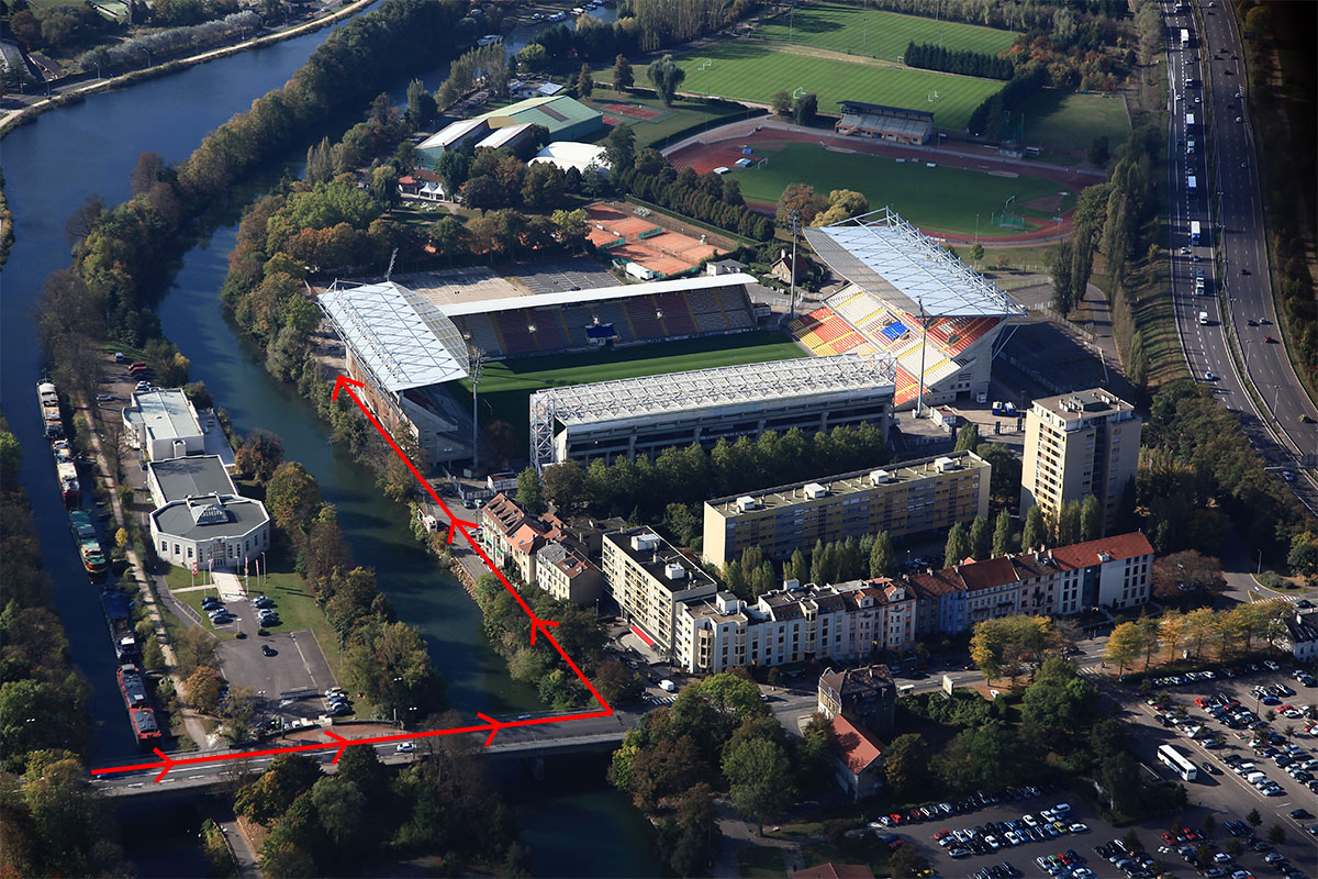 All English supporters have to come by the Stadium Street (“Rue du Stade”) along the Mosel Canal (in red on the picture). It will be the only way to reach the visiting supporters’ stand.