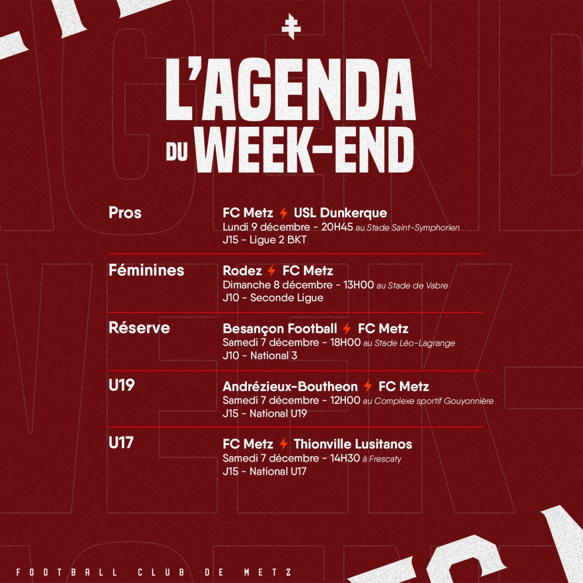 15ème journée U19 National : Andrézieux-Bouthéon - FC Metz à 12h00